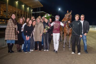 Conrad Lugauer hade taktiken klar i den avslutande avdelningen bakom årsdebuterande Hitting Hard. Det var ledningen som gällde och efter ett halvvarv satt ekipaget i täten. Väl där fick Hitting Hard bestämma farten och det räckte till en lätt seger och Hitting Hard har alla förutsättningar att ta stora kliv i karriären.